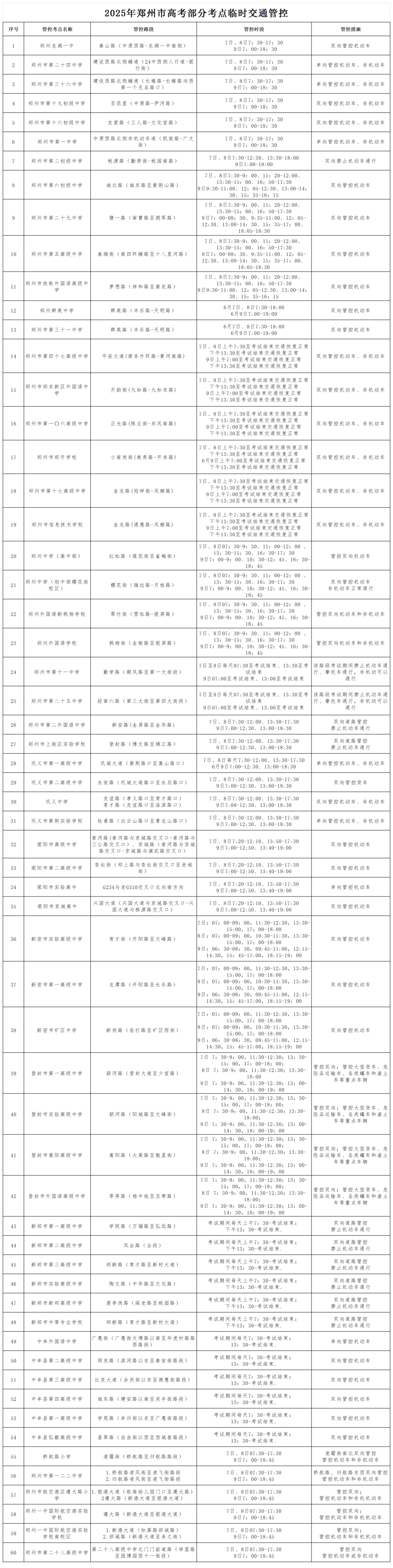 据悉,部分考点周边由于道路狭窄,停车位少,考生和送考家长众多,停车需求大,交通压力较大。为确保考点周边道路畅通,郑州交警经过调研梳理,对全市39个考点周边新增8535个临时停车位,将对60个考点门前道路采取禁行、限行等临时性交通管理措施,具体信息如下: