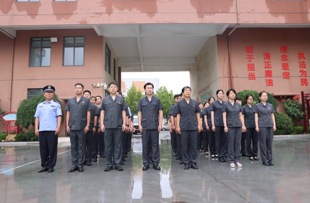 7月1日清晨,在管城法院南曹人民法庭院内举行了庄严的升旗仪式。尽管细雨绵绵,却丝毫未减管城法院干警的热情与庄重。护旗法警身着笔挺警礼服,迈着铿锵有力的步伐护送国旗入场。仪式现场的干警整齐列队,在雄壮国歌声中,庄严肃穆地注视着五星红旗在雨中冉冉升起,心中满是对党的忠诚与热爱,爱国之情在这特殊时刻愈发浓烈。