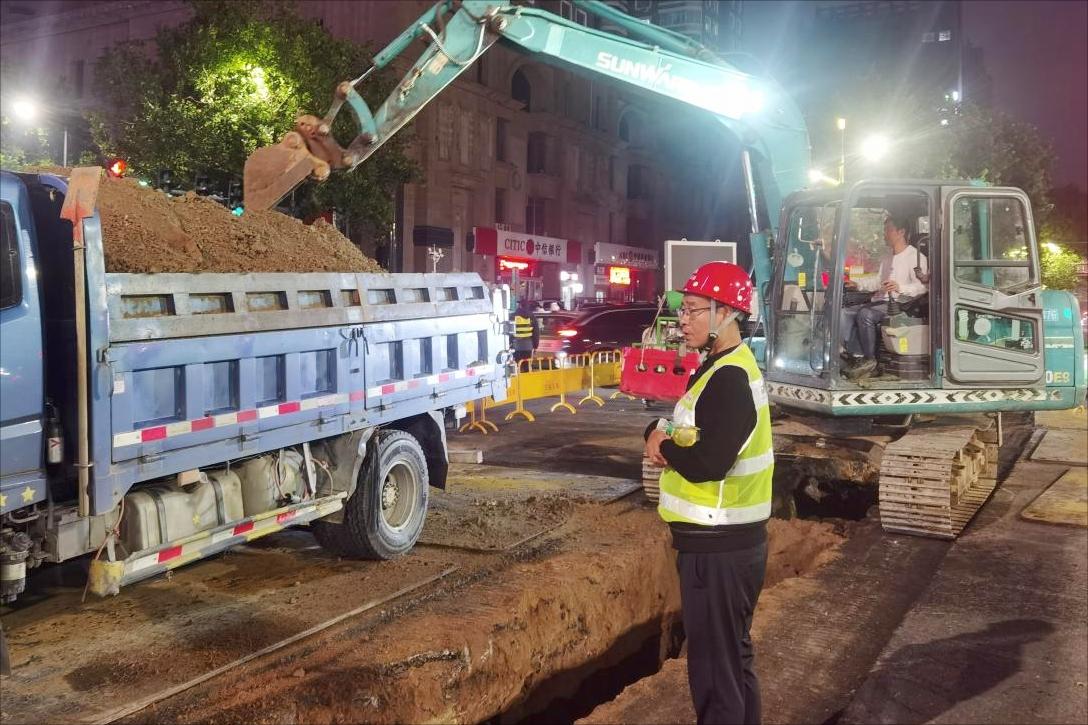 9月30日晚,前期安全防护工作全部就绪,施工作业随即正式开展。在现场,施工人员按照方案分工协作,开挖、清理操作坑、测量管道长度、吊装管件……一道道忙碌的身影穿梭在工地,各个流程衔接紧密、有条不紊。经人机协同的昼夜奋战,10月6日,这条全长2787米的老旧供水管道改造工程顺利完工,直接惠及约10万户居民的日常用水。
