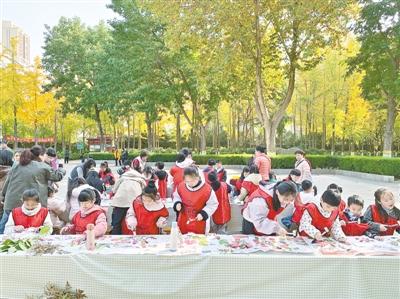 深秋的文博广场,600余株银杏渐黄,为弘扬植物拓印非遗技艺,展示“无废公园”创建成果,2日上午,郑州市公园广场事务中心在此举办“落叶遇见非遗拓印 指尖留住秋日诗意”中小学生非遗拓印体验活动。近百名中小学生将秋日印记定格于棉质手帕,感受自然与传统文化的深度共鸣。