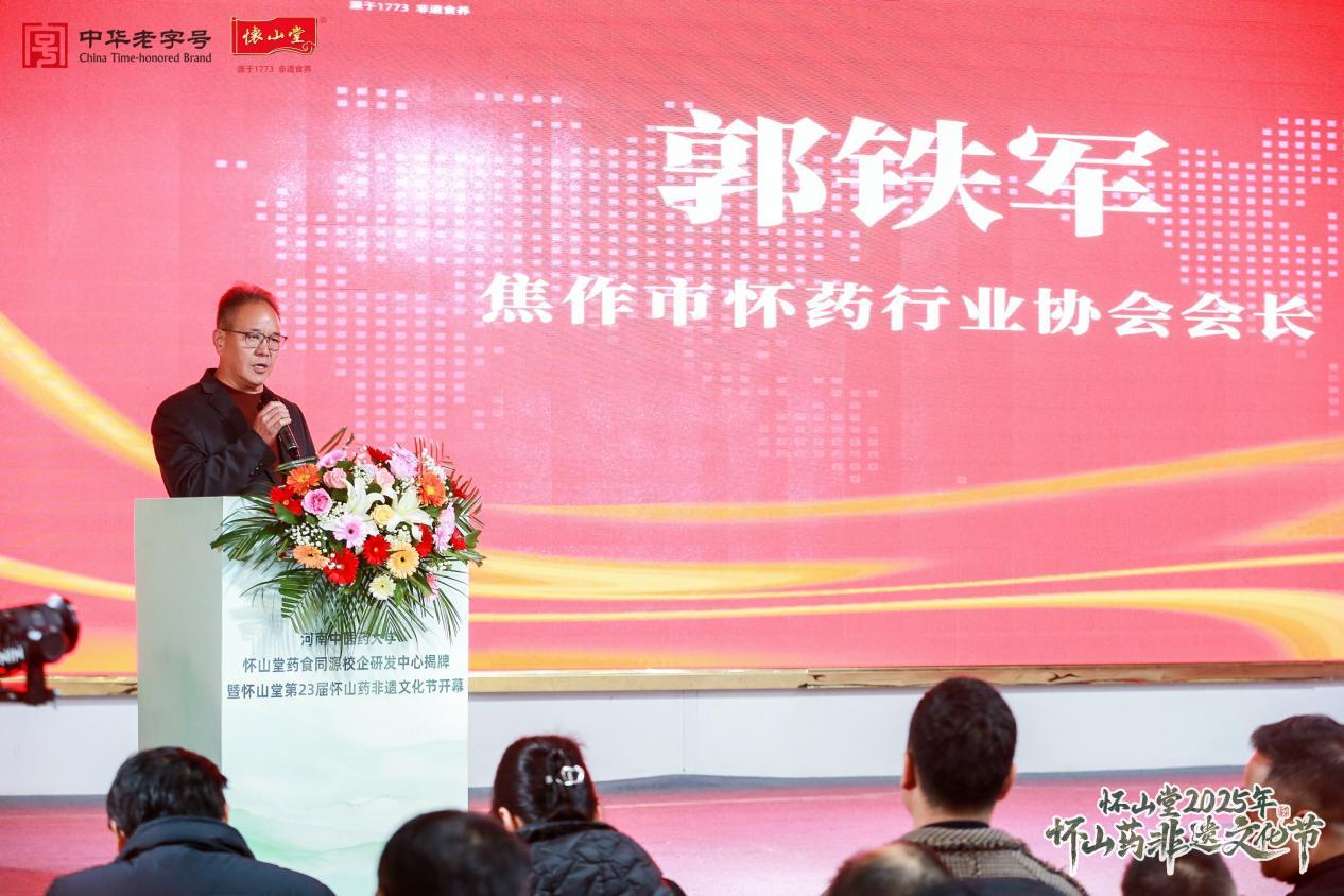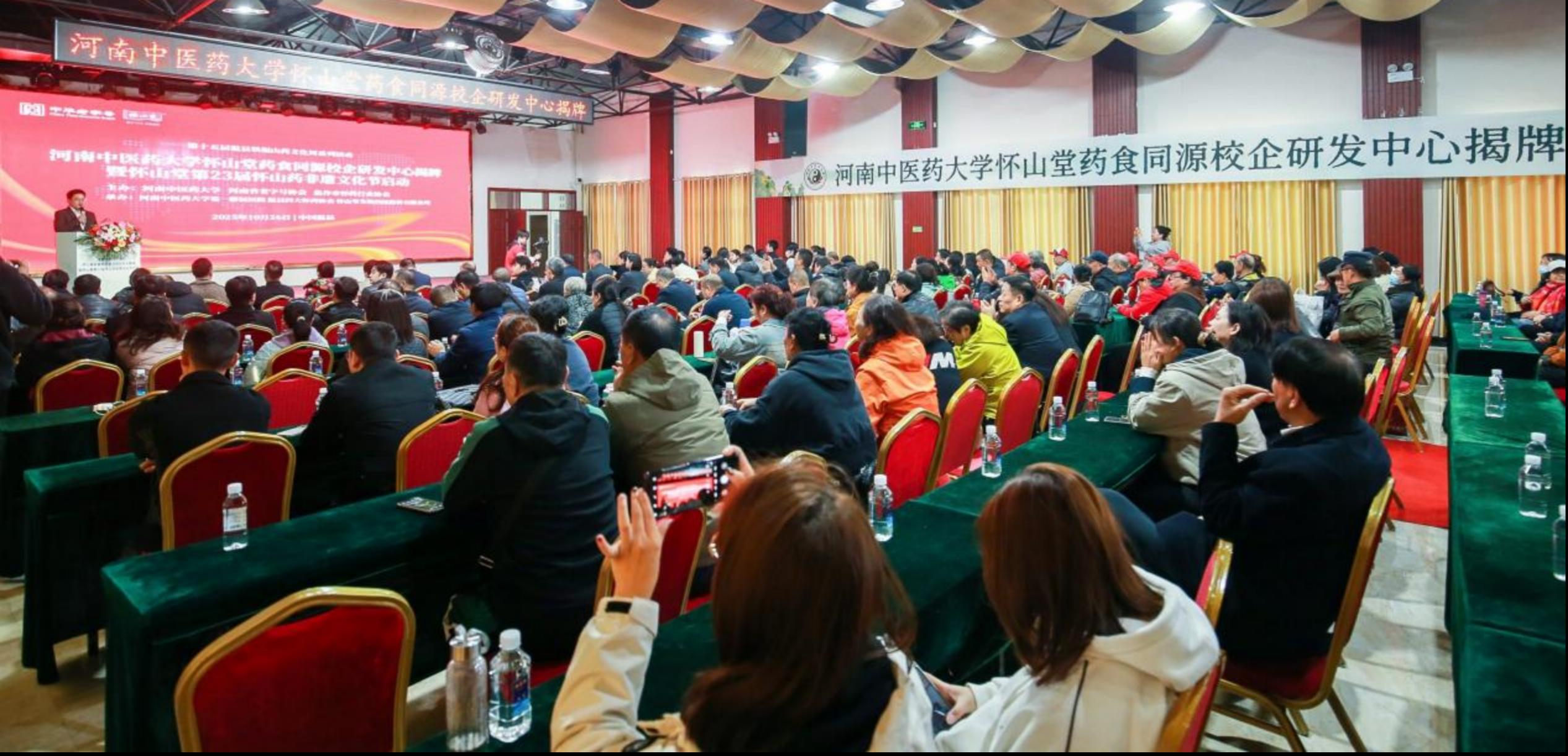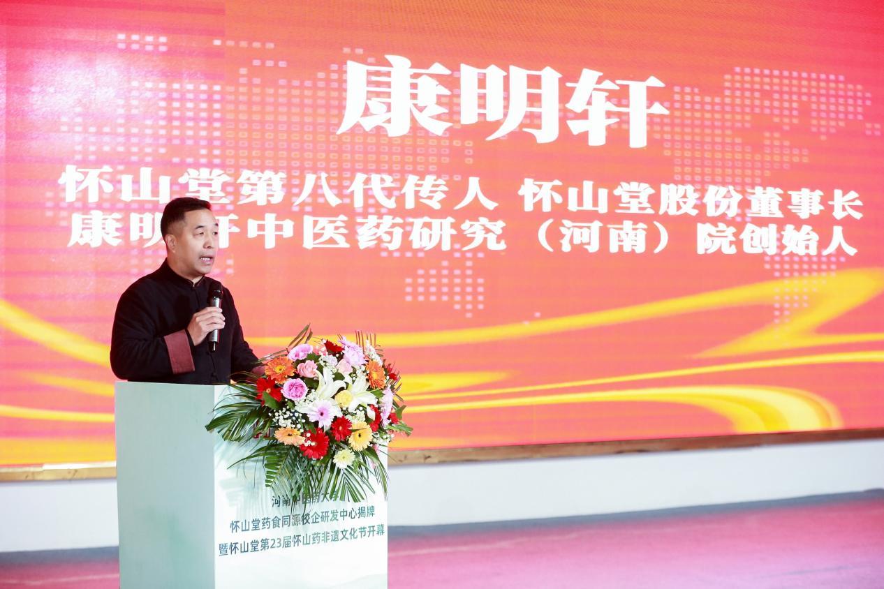社区文化网讯(张雷龙)10月26日,“河南中医药大学怀山堂药食同源校企研发中心揭牌暨怀山堂第23届怀山药非遗文化节启动”活动在温县怀山堂总部举行。河南省政府参事、河南省老字号协会名誉会长赵志正,温县农业农村局副局长任小红,焦作市怀药行业协会会长郭铁军,河南省老字号协会副会长兼秘书长程振中,温县四大怀药秘书长王亚鹏,河南中医药大学第一附属医院儿童脑病诊疗康复中心副主任白青云教授、儿科脑病康复心理病区主任党伟利教授,怀山堂第九代传人、副董事长康静,河南中医药大学研发团队,中国质量报、凤凰网、中国食品安全网、央广网、河南日报、顶端新闻、网易新闻、正观新闻、河南广播(大象新闻)、河南交通广播、郑州音乐广播等媒体代表,以及200多名来自全国各地的非遗食养爱好者、怀山堂忠实消费者共同参与此次盛会。怀山堂第八代传承人康明轩出席并致欢迎辞。