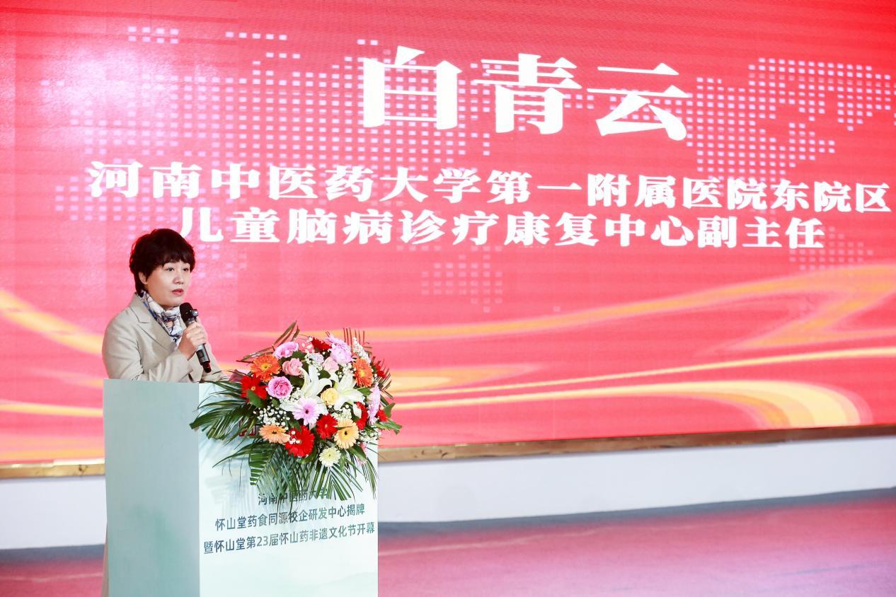 河南中医药大学第一附属医院儿童脑病诊疗康复中心副主任白青云教授介绍校企研发中心相关情况,中心将融合高校全国领先的科研优势与龙头企业怀山堂的产业链资源优势,围绕怀山药等药食同源食材的价值研究及相关产品研发开展深度合作,让千年非遗技艺搭上现代科技的“快车”。