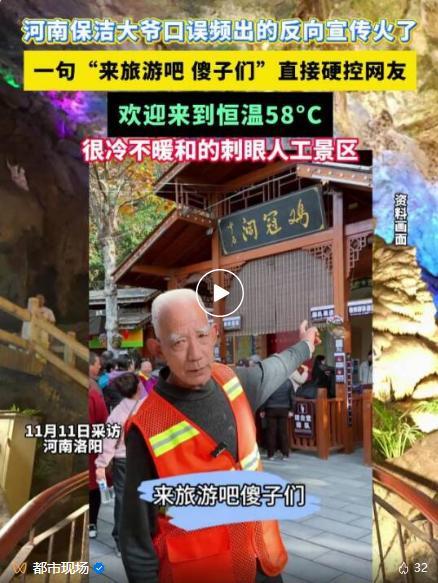 11月10日,河南洛阳鸡冠洞景区,一保洁大爷反向宣传火了,网友:“好嚣张的宣传词,句句意料之外,该视频点赞量超过65万”。