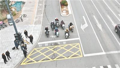 12月24日上午,在郑州市花园路与国基路交叉口,4个交路口的非机动车停车线白线均进行了后移,在非机动车停车线前还施划了“停车不越线”几个醒目的白字,在这些字前面施划了黄色网格线,提示非机动车驾驶人不停车越线,不占压黄方格停留等候。在交警的指挥下,非机动车驾驶人均在停车线前有序停车等候绿灯放行,路口交通秩序井然。