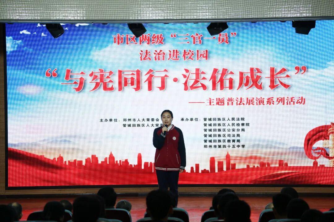 12月1日上午,“与宪同行 法佑成长”主题普法展演活动圆满举行。郑州市人大常委会副主任周亚民、郑州市中级人民法院院长陈殿福等领导出席活动,与郑州市第四十五中学师生共同观摩了这场别开生面的法治实践课。