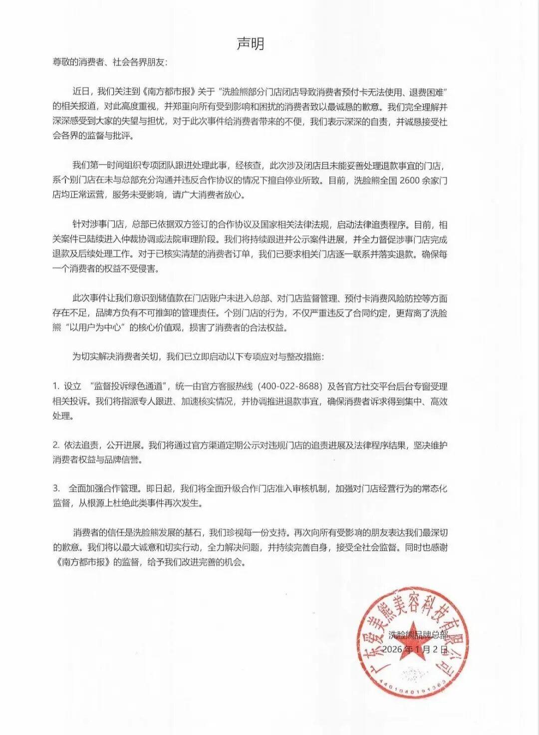 门店跑路后退款难,且会员卡在其他门店无法使用; 门店前一天还在发朋友圈宣传,次日便人去楼空,且去其他门店查询后被告知并非会员,即充值的款项没有进入公司系统。 消费者就此质疑 门店是否早就想跑路 针对此事,洗脸熊创始人唐华波向记者表示,对于公司监管不到位深感自责,将切实维护好消费者的权益。 洗脸熊也就此事 发布正式声明 ↓↓↓ 企业高度重视部分消费者反馈的门店闭店导致预付卡退费难等问题,并郑重向所有受到影响和困扰的消费者致以最诚恳的歉意,诚恳接受社会各界的监督与批评。 企业第一时间组织专项团队跟进处理此事,经核查,此次涉及闭店且未能妥善处理退款事宜的门店,系个别门店在未与总部充分沟通并违反合作协议的情况下擅自停业所致。目前,洗脸熊全国2600余家门店均正常运营,服务未受影响,请广大消费者放心。 针对涉事门店,洗脸熊总部已依据双方签订的合作协议及国家相关法律法规,启动法律追责程序。目前,相关案件已陆续进入仲裁协调或法院审理阶段。企业将持续跟进并公示案件进展,并全力督促涉事门店完成退款及后续处理工作。对于已核实清楚的消费者订单,企业已要求相关门店逐一联系并落实退款。确保每一个消费者的权益不受侵害。 此次事件让公司意识到储值款在门店账户未进入总部、对门店监督管理、预付卡消费风险防控等方面存在不足,品牌方负有不可推卸的管理责任。 公司已立即启动以下专项应对与整改措施,包括设立 “监督投诉绿色通道”、依法追责并公开进展,以及全面加强合作管理。即日起,公司将全面升级合作门店准入审核机制,加强对门店经营行为的常态化监督,从根源上杜绝此类事件再次发生。 单次洗脸项目价格 洗脸熊官网显示,其由古天乐代言,主打皮肤清洁,品牌宣称“不卖货,只洗脸”“男生女生都爱的洗脸品牌”。洗脸熊主体企业为广东爱美熊美容科技有限公司,位于广州市海珠区,该公司成立于2021年。 针对洗脸熊多家门店被曝跑路一事,2025年12月31日,广州市海珠区商务科方面向记者表示,该部门已陆陆续续收到多起类似的投诉,该部门了解到,洗脸熊以加盟为主,该公司实际上是对品牌进行管理,而对充值收费这方面的管理并没有统一,海珠区商务科已联系该企业进行沟通。 广州市海珠区市场监管局回应记者称,该局已知悉相关情况,并对该公司总部加强监管,如有市场监管领域的违法违规行为将依法依职责查处。 “洗脸吧”这一主打洗脸服务的美容门店并不少见,目前市面知名的品牌有洗脸熊、洗脸猫、洁小白等,这些品牌均看中“面部清洁护理”这一细分赛道。 不过,前述多个品牌的洗脸项目并不便宜,从几十元到上百元不等。以广州一家洗脸熊门店为例,美团平台显示,公司推出清洁黑头、净油祛痘等多个套餐,单次项目价格区间为53元-240元。 除了洗脸熊外,由林志颖代言的洗脸猫也曾被曝部分门店跑路。凌雁管理咨询首席分析师林岳曾向记者指出,轻美容小店模型虽然吸引加盟商,但若没有完善的评估体系及门槛,加盟商质量必定参差不齐,更为缺陷的是,总部无法掌控会员预付费,这导致门店跑路后消费者无法退款等问题。