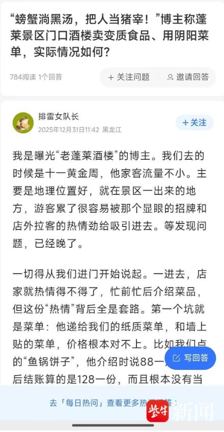 山东烟台一家名为“老蓬莱酒楼”的饭店曾在2024年因打包塑料袋10元一个上过热搜,此后关于该酒楼的投诉依然经常出现。有网友近日在腾讯热问发帖,称他们在2025年十一黄金周期间到老蓬莱酒楼吃饭,遇到食材疑似变质、价格前后不一、饮料过期等问题,向主管部门投诉未得到有效反馈。扬子晚报紫牛新闻记者联系该酒楼,店家没给实质性回应。蓬莱旅游度假区管理委员会1月4日表示,已经了解到这一事件,当地市场监管部门正在调查取证,如经调查属实,将依法依规严肃进行处理。