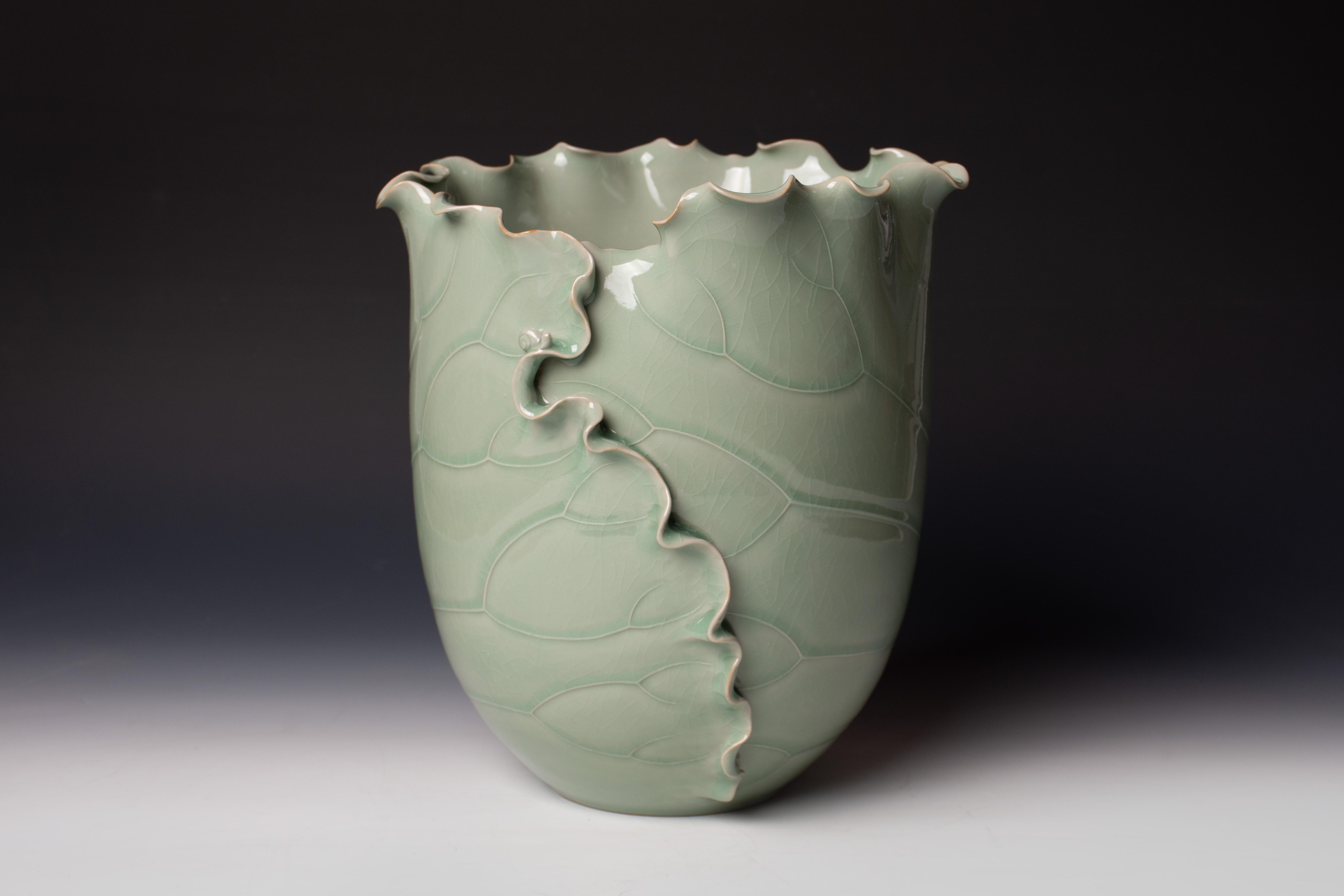 《和合》的创作,凝聚着弘宝汝瓷团队对汝瓷技艺的敬畏与对自然之美的感悟。作品以荷叶为创作原型,取“荷”与“和”“合”的谐音,既延续了中国传统文化中“以物喻德”的美学传统,又传递出跨越山海的“和谐共生”期盼。作为国家级非物质文化遗产(汝瓷烧制技艺)的传承载体,《和合》完美展现了汝瓷“温润如玉、釉色天成”的核心特质。其天青釉色温润饱满,釉面光洁细腻,既有“雨过天青云破处”的古典韵味,又透着清新雅致的当代审美;作品由享有国务院特殊津贴专家、中国工美行业艺术大师王振芳与非遗传承人范至简联合创作完成,师徒携手让《和合》既承载着千年汝瓷的技艺传承,又蕴含着对新时代和谐理念的诠释。