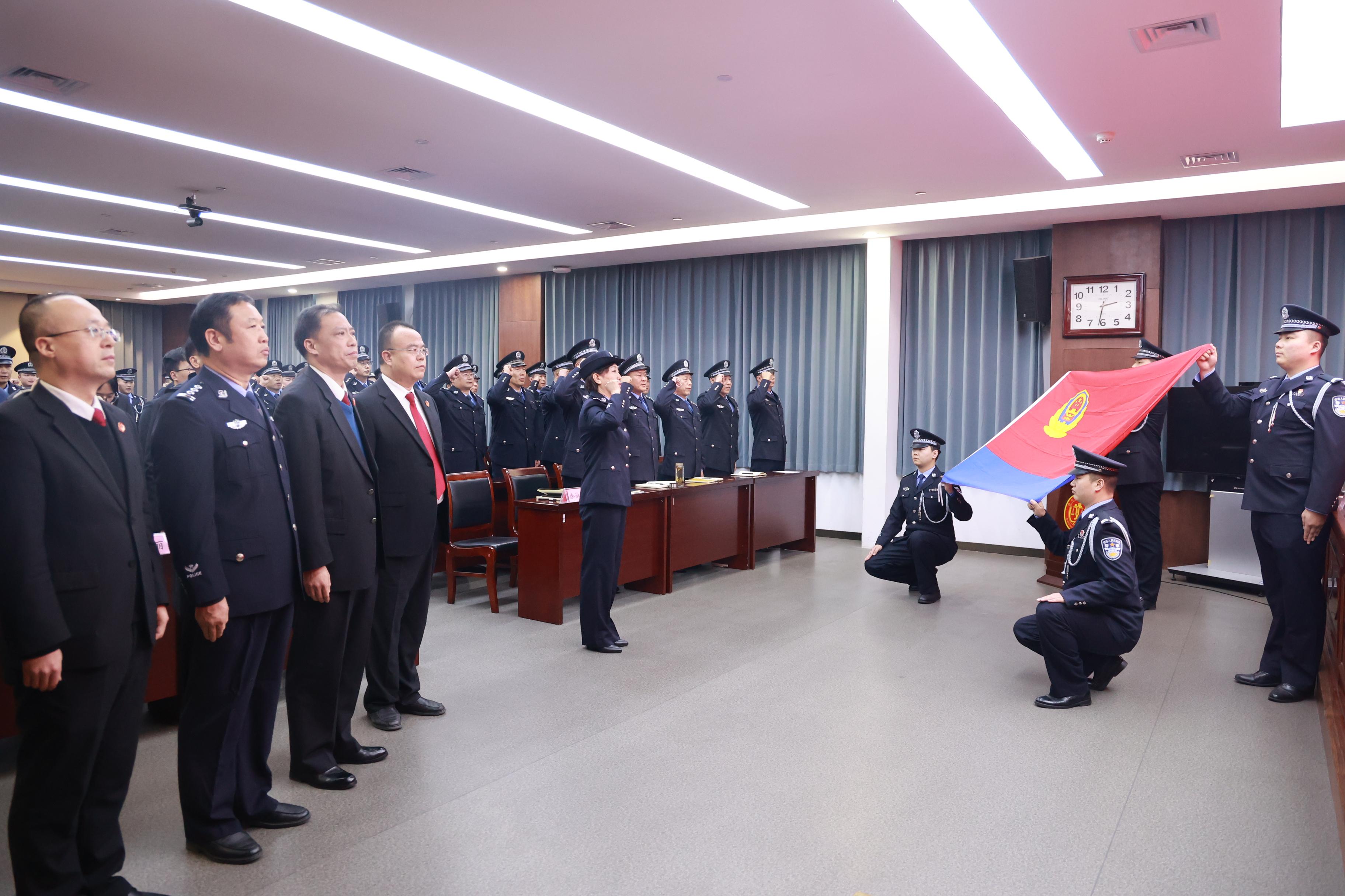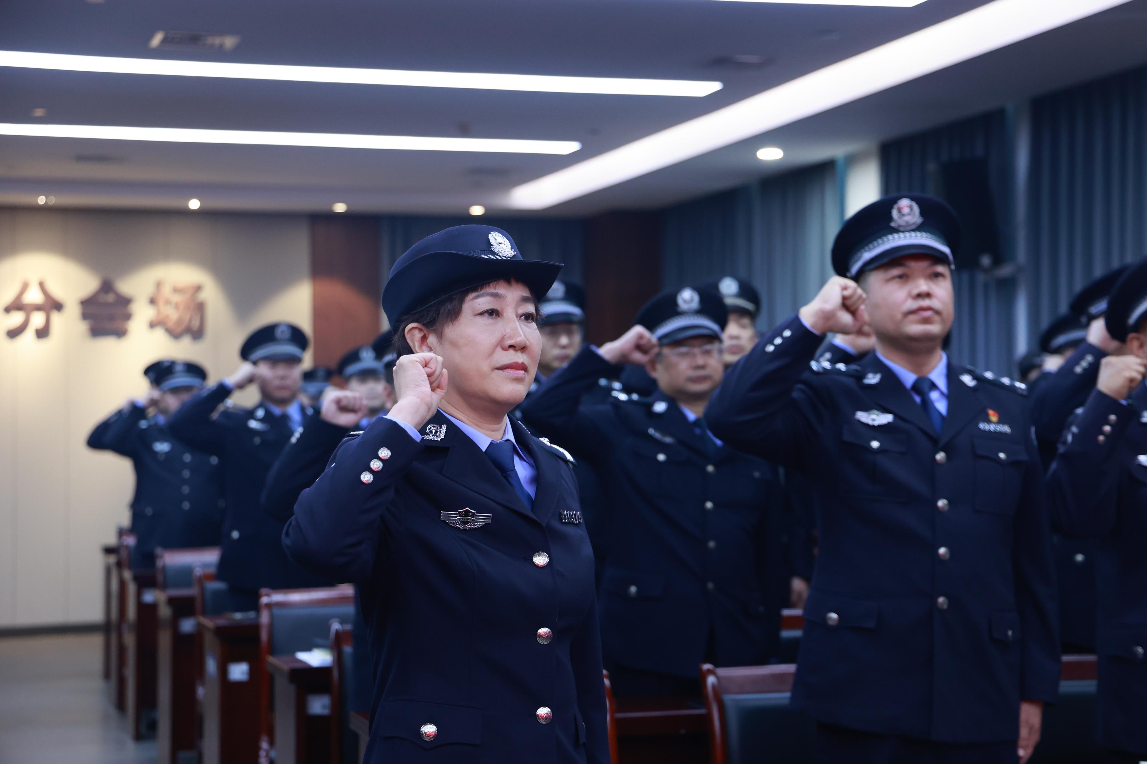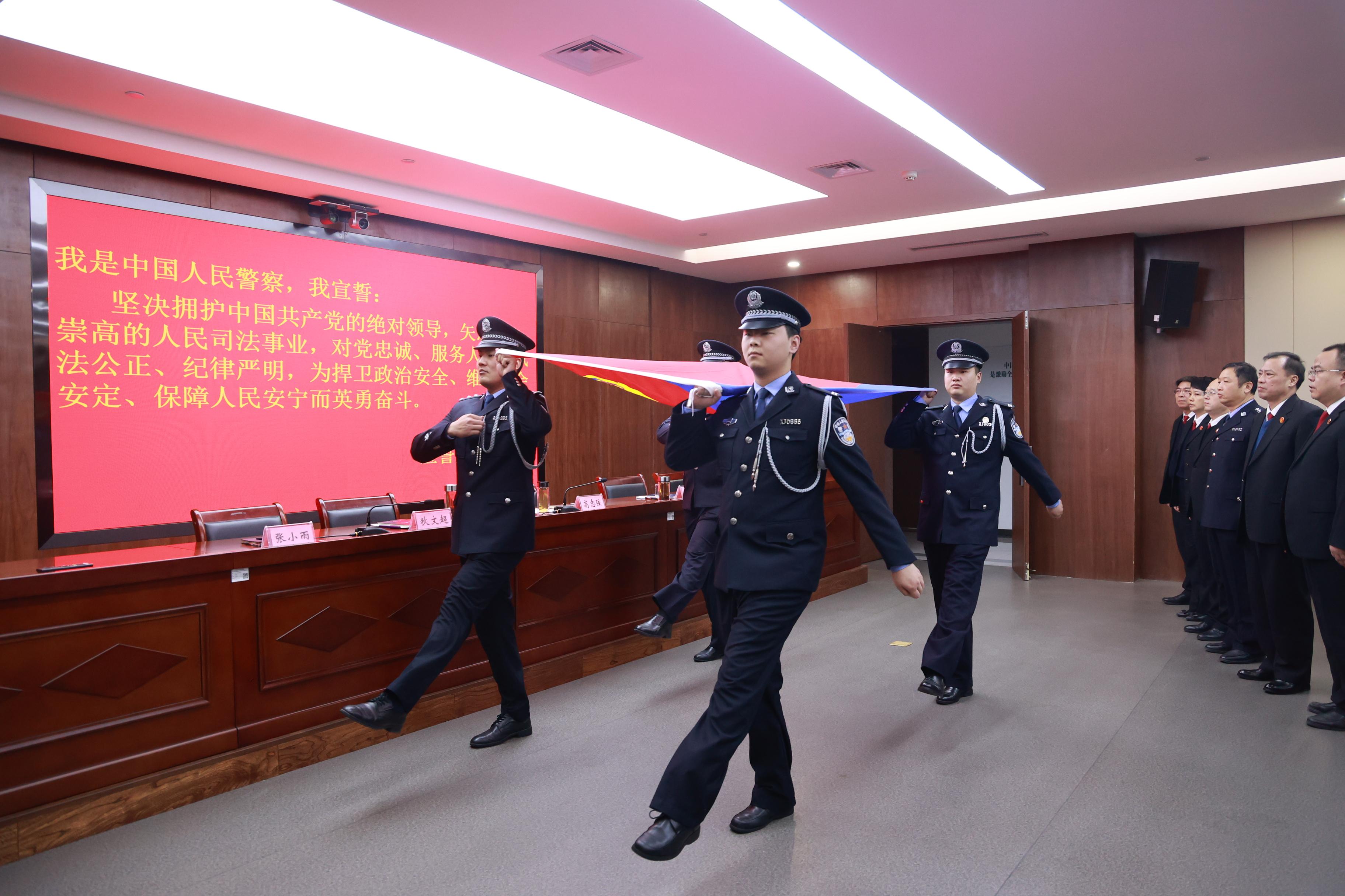 “我是中国人民警察,我宣誓:坚决拥护中国共产党的绝对领导,矢志献身崇高的人民司法事业……”在工作30载,光荣退休的徐淑红同志的带领下,全体司法警察身着警服、警容严整,面向警旗,紧握右拳,铿锵誓言响彻全场。