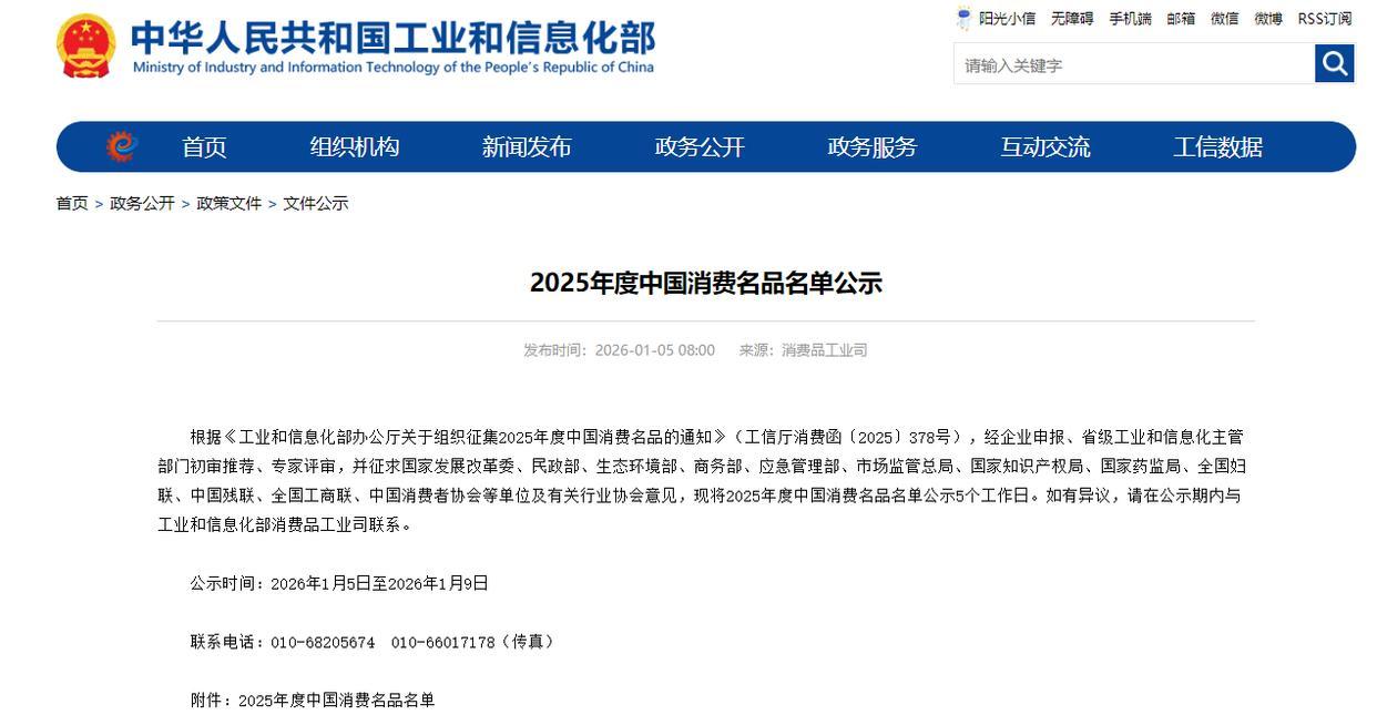 根据《工业和信息化部办公厅关于组织征集2025年度中国消费名品的通知》(工信厅消费函〔2025〕378号),经企业申报、省级工业和信息化主管部门初审推荐、专家评审,并征求国家发展和改革委员会、民政部、生态环境部、商务部、应急管理部、市场监管总局、国家知识产权局、国家药监局、全国妇联、中国残联、全国工商联、中国消费者协会等单位及有关行业协会意见,现将2025年度中国消费名品名单公示5个工作日。如有异议,请在公示期内与工业和信息化部消费品工业司联系。