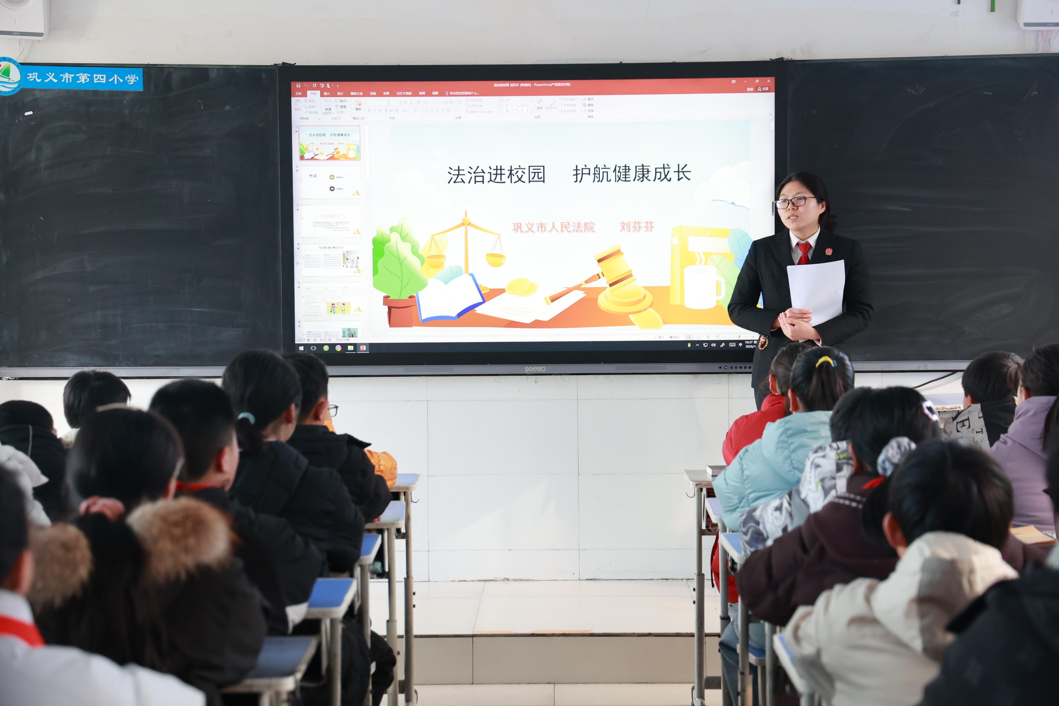 社区文化网讯(通讯员 杨晓芳)为进一步增强未成年人法治观念,提升自我保护能力,1月7日,巩义市人民法院城区人民法庭法官助理刘芬芬走进巩义市第四小学,开展以“法治进校园 护航健康成长”为主题的法治宣传教育活动。