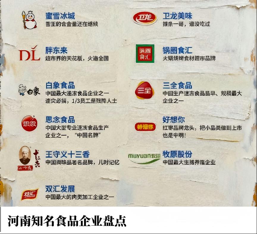 你吃的火腿肠(双汇)、你吃的速冻水饺(三全、思念)、你吃的方便面、面粉、调料。甚至你吃的猪肉(牧原)。大概率都是河南产的。