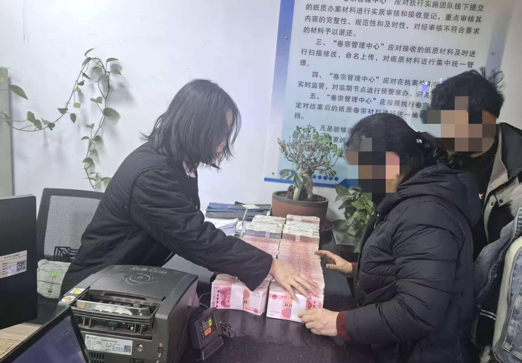 1月23日下午4点,被执行人张某家属来到执行局,4名执行干警,数了一个小时,才将150万现金清点清楚。