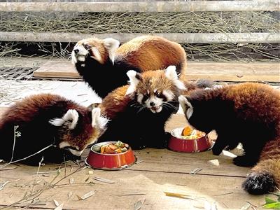 8点整,陈泽冰的身影出现在小熊猫笼舍前。她先是习惯性地在观察窗外观察里面的动静。小熊猫们有的蜷在栖架上,有的在食盆边嗅闻,一切如常,她才轻轻舒了口气。“它们很敏感,一点陌生的声响或过快的动作都可能让它们产生应激反应。”陈泽冰压低声音解释。