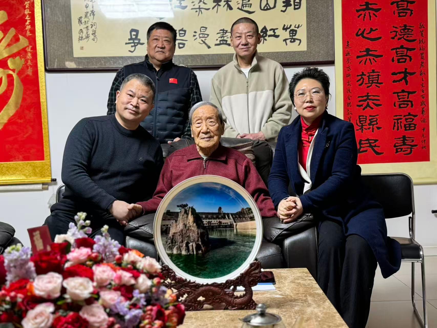 三门峡水利枢纽管理局局长牛锐锋(左一)和黄河缘公益基金会理事长文捷(右一)去家中看望《三门峡歌》作者、著名剧作家贺敬之老人,并和贺小雷(右二)、王奇(左二)在中流砥柱骨瓷盘后合影留念