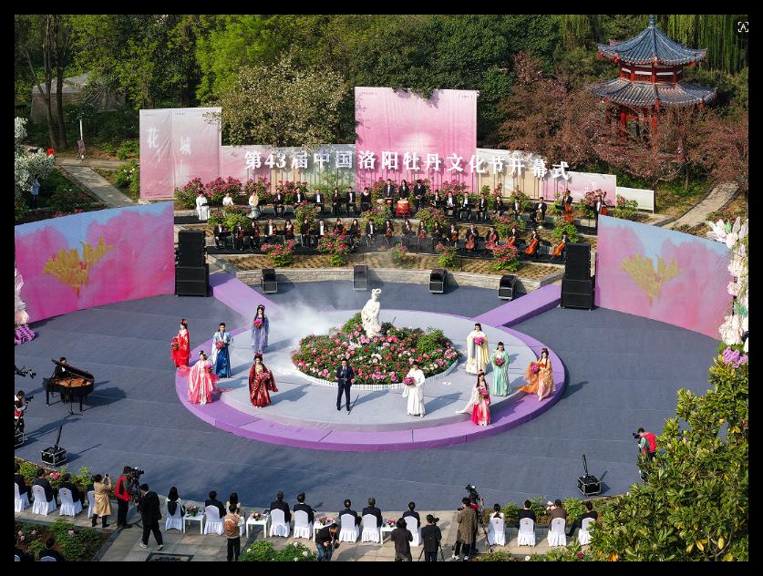 上午9时,童声朗诵《诗经·鹿鸣》拉开了演出序幕。舞台诗剧《古今赏花人》上演了一场跨越时空的赏花之旅,赏花人邂逅顾恺之、刘禹锡、欧阳修等文人墨客,再现洛神起舞、赏花行春、插花簪花等历史情景,又在河洛大鼓的悠扬韵调中回到当下的“花漾时代”,勾勒出洛阳牡丹花开千年的厚重底蕴。